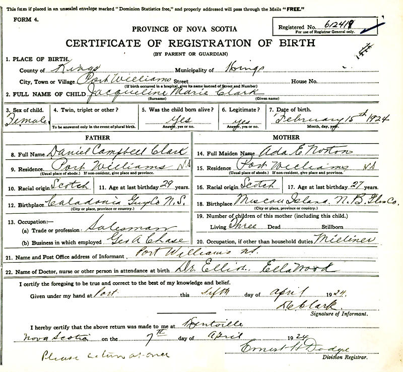 Birth Born on February 15, 1924 in Port Williams, Kings Co., NS Marriages RICE, Cyril Adams Married on March 27, 1946 in Truro, Colchester Co., NS Notes Occupation: Stenographer Images Jacqueline Clark Birth Cyril Rice Marriage