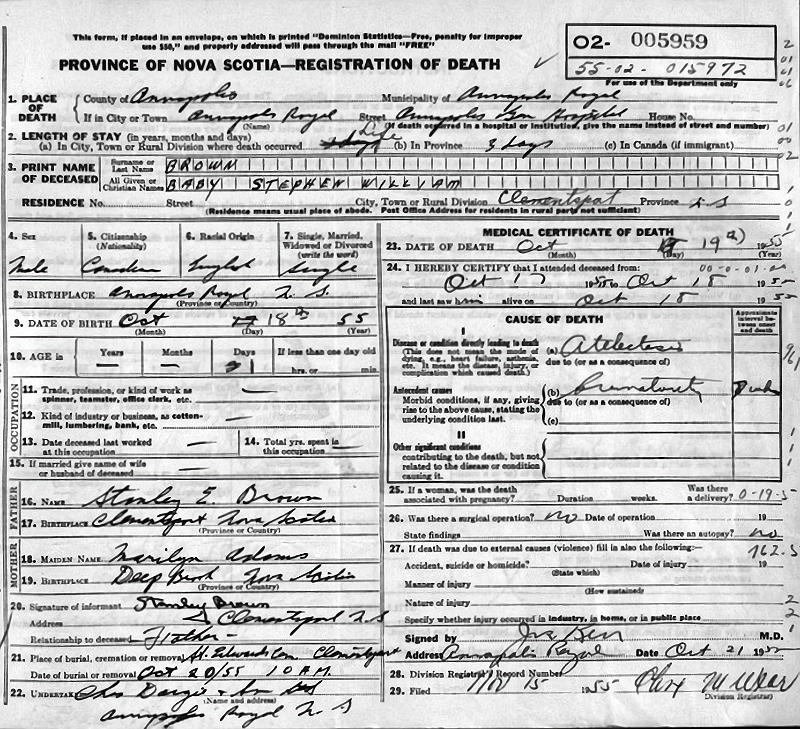 Parents Father: BROWN, Stanley Ernest Mother: ADAMS, Marilyn Birth Born on October 18, 1955 in Annapolis Royal, Annapolis Co., NS Death Died on October 19, 1955 in Annapolis Royal, Annapolis Co., NS Buried in Old St. Edwards Anglican Church Graveyard in Clementsport, Annapolis Co., NS Notes Death: Atelectasis Sources Nova Scotia Deaths: Year 1955 #5959 Images Stephen Brown Death Stephen Brown