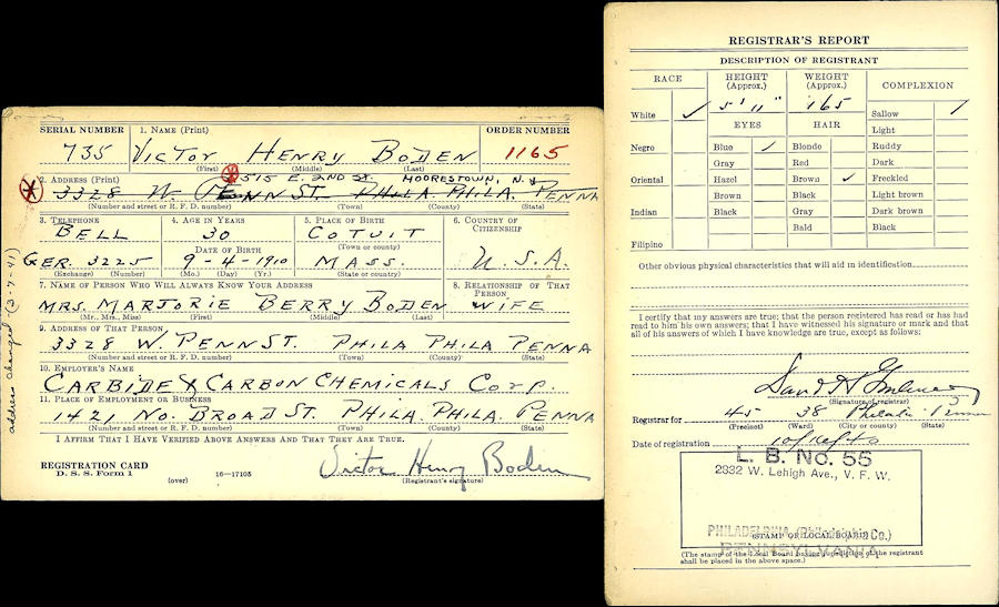Parents Father: BODEN, Clarence Henry Mother: NICKERSON, Clara Hall Birth Born on September 04, 1910 in Cotuit, Barnstable Co., MA Death Died on August 11, 1976 in Barnstable Co., MA Buried in Mosswood Cemetery in Cotuit, Barnstable Co., MA Marriages BERRY, Marjorie Notes Occupation: Employee at Carbide & Carbon Chemical Corp. Sources Massachusetts Deaths: #038401 Images Victor Boden Victor Boden WW2 Draft