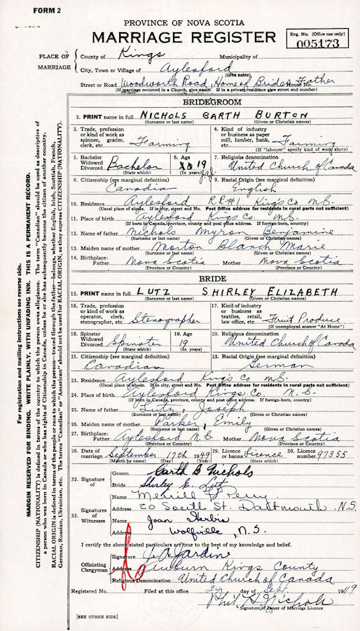 Parents Father: NICHOLS, Myron Benjamin Mother: MORTON, Blanche Marie Birth Born on October 18, 1929 in Aylesford, Kings Co., NS Death Died on February 06, 2022 in Willington, Tolland Co., CT Buried in Willington Hill Cemetery in Willington, Tolland Co., CT Marriages LUTZ, Shirley Elizabeth Married on September 17, 1949 in Aylesford, Kings Co., NS Children NICHOLS, Eric Garth: August 16, 1957 Notes Occupation: Farmer Sources Cemetery: Willington Hill Cemetery Willington,CT Images Garth & Shirley (Lutz) Nichols Garth Nichols Marriage