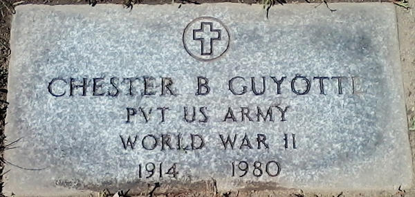 Parents Father: GUYOTTE, Frederick Martin Mother: WHITE, Inez Elizabeth Birth Born on September 28, 1914 in Churubusco, Clinton Co., NY Death Died on June 21, 1980 in Norton, Bristol Co., MA Buried in Timothy Plain Cemetery in Norton, Bristol Co., MA Marriages CASKEY, Cornelia Clay Children GUYOTTE, John C.: September 21, 1949 Notes Military Service: WW2 US Army Sources Massachusetts Deaths: #032646 Images Chester Guyotte Chester Guyotte