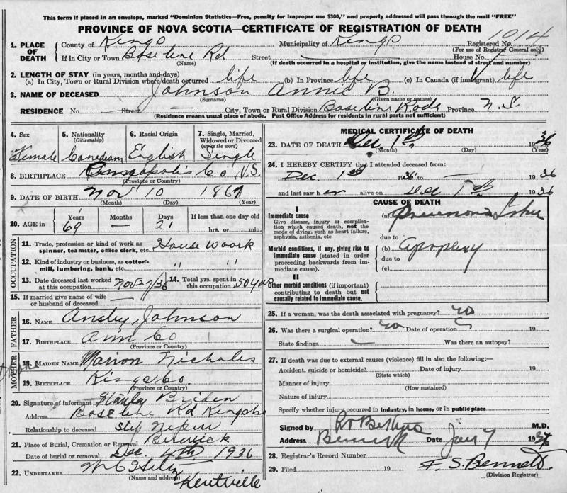 Parents Father: JOHNSON, Ansley Mother: NICHOLS, Mariah Birth Born on November 10, 1867 in Annapolis Co., NS Death Died on December 01, 1936 in Base Line Road, Kings Co., NS Buried in Berwick Cemetery in Berwick, Kings Co., NS Notes Death: Lobar Pneumonia Sources Nova Scotia Deaths: Year 1936 File 148 #1014 Images Ansley & Mariah (Nichols),Eugene,Annie Johnson,Ardellis (Johnson) Brydon Annie Johnson Death