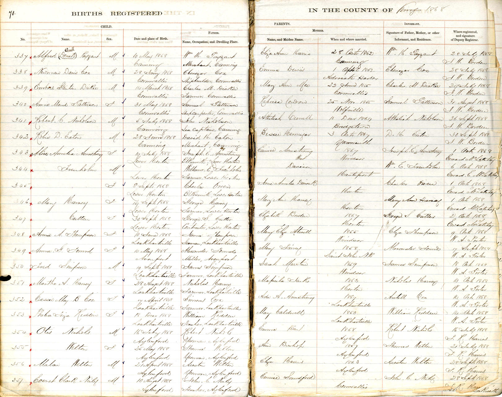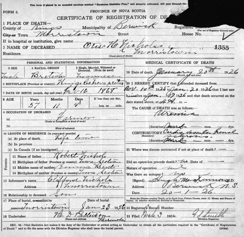Parents Father: NICHOLS, Robert Mother: BENT, Emma Ann Birth Born on February 16, 1868 in Aylesford, Kings Co., NS Death Died on January 20, 1926 in Morristown, Kings Co., NS Buried in Morristown Cemetery in Morristown, Kings Co., NS Marriages COGSWELL, Carrie Lena Married on February 06, 1901 in Morristown, Kings Co., NS Children NICHOLS, Hilda Margaret: January 13, 1902 - August 23, 1986 NICHOLS, Clifford Otis: July 17, 1904 - October 23, 1984 NICHOLS, Lalia Rebecca: December 20, 1906 - August 25, 2002 Notes Occupation: Carpenter/ Farmer Death: Uremia Obituary: Morristown, Jan.25,1926 - On Wednesday morning, Jan. 20th, at his home here, the death occurred of Otis H. Nichols, one of the prominent farmers of Western Kings, at the age of 57 yrs. He was also a carpenter by trade and a master workman. His entire life was spent in his home community, having lived on the homestead of his parents, both of whom pre-deceased him several years age. And it is this community that his many sterling qualities won for him the highest esteem of neighbour and friend. He leaves a widow, two daughters - Mrs. Lorimer Rainforth, Morristown; Miss Laliah, who has been attending the Normal College, Truro; and one son, Clifford, at home. Also one brother, G.R. Nichols, Berwick, besides a large circle of other relatives. Sources Nova Scotia Deaths: Year 1926 File 93 #1355 Images Otis Nichols Birth Otis & Carrie (Cogswell) Nichols Otis Nichols Death Otis Nichols Marriage